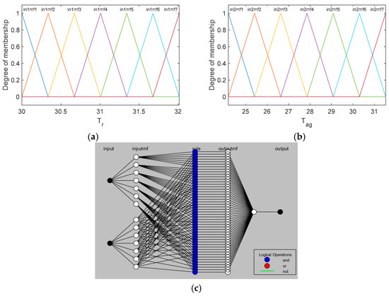 The proposed fuzzy control for refrigerant flow control. (a) Input membership function Tr. (b) Input membership function Tag. (c) The neural network used to determine the 49 rules used in defuzzification.