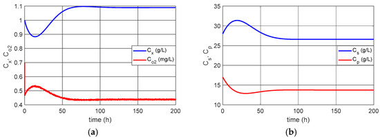 For numerical simulations it will be considered, fourth order Runge–Kutta method, with integration step (h = 0.01), and parameters [3,12]: A1 = 9.5 × 108, A2 = 2.55 × 1033, AT = 1, Fi = 51 [L/h], Fe = 51 [L/h], Cheat,ag = 4.18 [Jg−1 K−1], Cheat,r = 4.18 [Jg−1 K−1], Ea1 = 55,000 [J/mol], Ea2 = 220,000 [J/mol], kla0 = 38 [h−1], Ks = 1.03 [g/L], Ks1 = 1.68 [g/L], KT = 3.6 × 105 [J h−1m−2K−1], R = 8.31 [Jmol−1K−1], RSP = 0.435, Rsx = 0.607, HCa = −0.303, HCl = 0.844, HCO3 = 0.485, HH = −0.774, HMg = −0.314, HNa = −0.550, HOH = 0.941, mCaCO3 = 100 [g], mMgCl2 = 100 [g], mNaCl = 500 [g], MCa = 40 [g/mol], MCaCO3 = 90 [g/mol], MCl = 35.5 [g/mol], MCO3 = 60 [g/mol], YO2 = 0.97, ΔHr = 518 [kJ/molO2], µO2 = 0.5 [h−1], µP = 1.79 [h−1], ρag = 1000 [g/L] and ρr = 1080 [g/L]. With initial conditions: [g/L], [g/L], [g/L], [mg/L], [°C], and [°C].