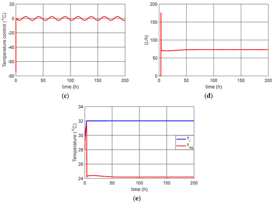 System with control of the coolant flow rate (Fag) and control of the reactor inlet temperature. (a) Output concentrations of biomass (Cx) and oxygen (). (b) Output concentrations of glucose (CS) and ethanol (CP). (c) Reactor inlet temperature control (Tin). (d) Coolant flow rate Fag. (e) Output temperature of the reactor (Tr) and the jacket (Tag).