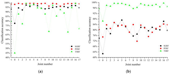 (a) Diagnostic accuracy of training set for each joint of a hexapod robot in three random forest algorithms; (b) Diagnostic accuracy of test set for each joint of a hexapod robot in three random forest algorithms. −1 indicates that all joints are functioning properly, 0 indicates that the first joint is malfunctioning, 1 indicates that the second joint is malfunctioning, and so on, up to 17.