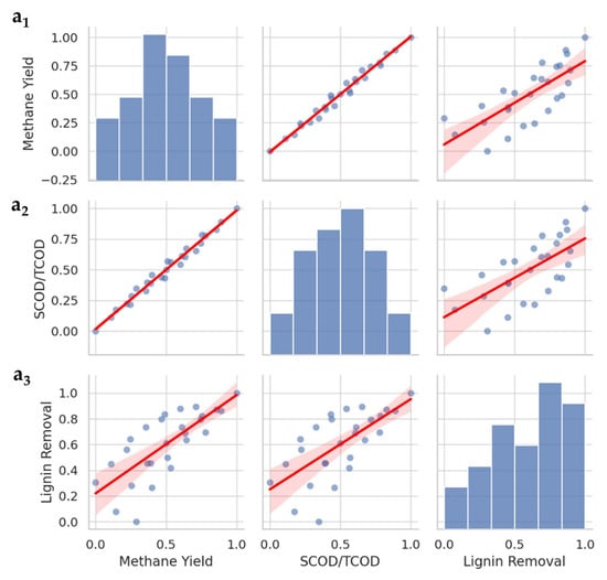 Matrix plot of the normalized response variables, (a1) CH4 yield, (a2) SCOD/TCOD, and (a3) lignin removal, generated based on the response surface methodology (RSM) model.
