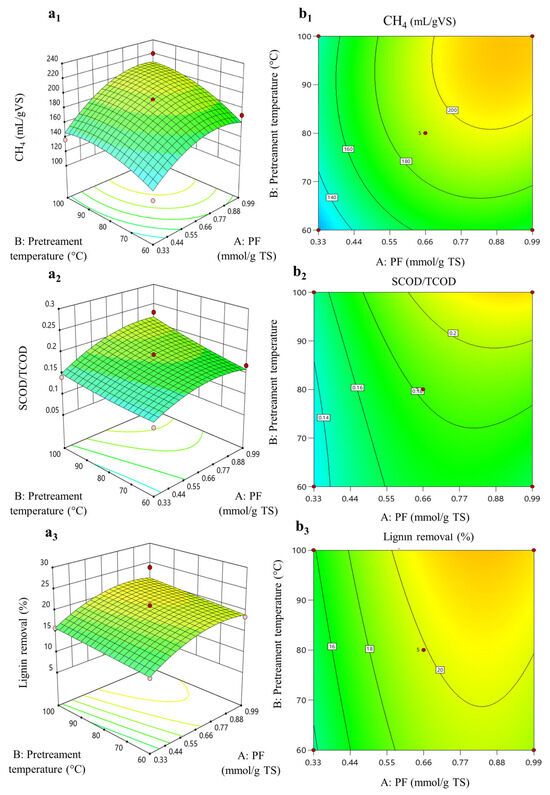 Three-dimensional response surface (a1–a3) and corresponding contour plot (b1–b3) illustrating the effect of key pretreatment factors on the target response variables (CH4 yield, SCOD/TCOD, and lignin removal). These plots visualize the interactive influence of process parameters and highlight optimal regions for the maximum response, supporting the statistical findings of the RSM-based model.