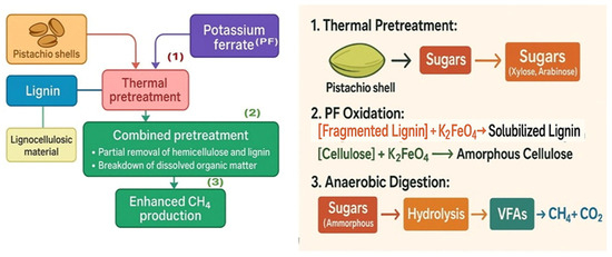 Among the emerging approaches, advanced oxidation processes (AOPs) have recently gained attention as promising chemical pretreatments to improve biomass hydrolysis [8]. Originally developed in the 1980s for water purification, AOPs generate hydroxyl (•OH) and more recently sulfate (SO4•−) radicals, which facilitate the breakdown of biomass polymers [9]. Potassium ferrate (PF) is considered a powerful and environmentally friendly oxidant due to its high redox potential, ranging between 0.72 and 2.20 V, depending on the pH [10]. In acidic conditions, the redox potential of ferrate ions (FeO42−) reaches 2.20 V, whereas it decreases to approximately 0.72 V in alkaline environments [11]. Despite its oxidative strength, the relatively high cost of PF and its potential to inhibit microbial activity at elevated doses limit its standalone application [12,13]. Consequently, coupling PF with thermal pretreatment under moderate temperatures offers a synergistic strategy to enhance lignin solubilization while mitigating adverse microbial impacts [14,15,16]. This integrated approach holds promise for improving subsequent CH4 production through more effective biomass disintegration.