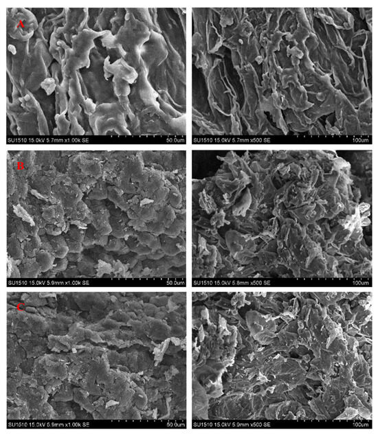 Scanning Electron Microscopy (SEM) images of PSs before and after pretreatment: (A) untreated PSs showing a compact and rigid surface morphology; (B) surface morphology after pretreatment under the conditions yielding maximum CH4 production (0.66 mmol/g TSs PF dose, 100 °C, 90 min), where visible surface cracks and increased porosity are evident; and (C) pretreatment conditions corresponding to the statistically optimized CH4 yield (0.637 mmol/g TSs PF dose, 66.76 °C, 55.85 min), exhibiting moderate disruption and surface expansion, indicating enhanced substrate accessibility.