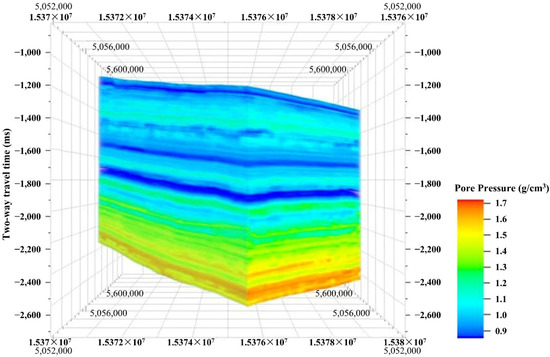The density logging trace could be predicted by using the same method as shown in Figure 5. The density logging data of other formations can be derived from the predicted sonic logging data (i.e., interval transit time) based on the empirical relationship. Figure 6 shows the three-dimensional pore-pressure prediction results for this area.