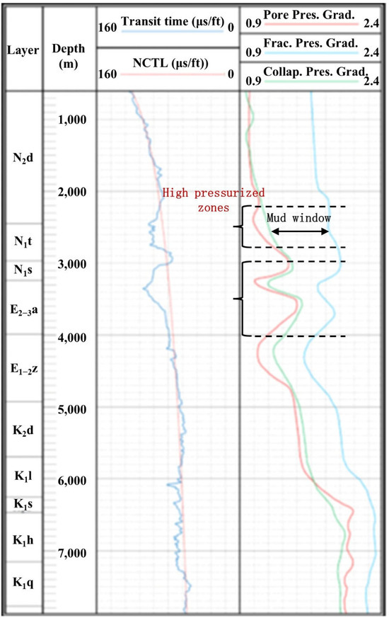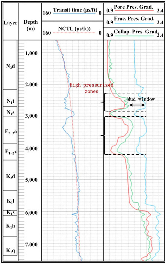 Figure 8 and Table 2 show the predicted three pressures for the well Huqian-1. From the deviation between P-wave acoustic transit time and the NCTL, it demonstrates two abnormal highly pressurized sections such as Taxihe Group (N1t) and Anjihaihe group (E2−3a), whose pore-pressure gradients reach 1.38 g/cm3 and 1.5 g/cm3, respectively. In these two sections, the corresponding mud density windows become narrower than the normal pressurized formations. This indicates that they are the most unsafe drilling depth sections for the well Huqian-1. The above practical application shows that the prediction model proposed in this paper is effective and feasible for practical drilling activities.