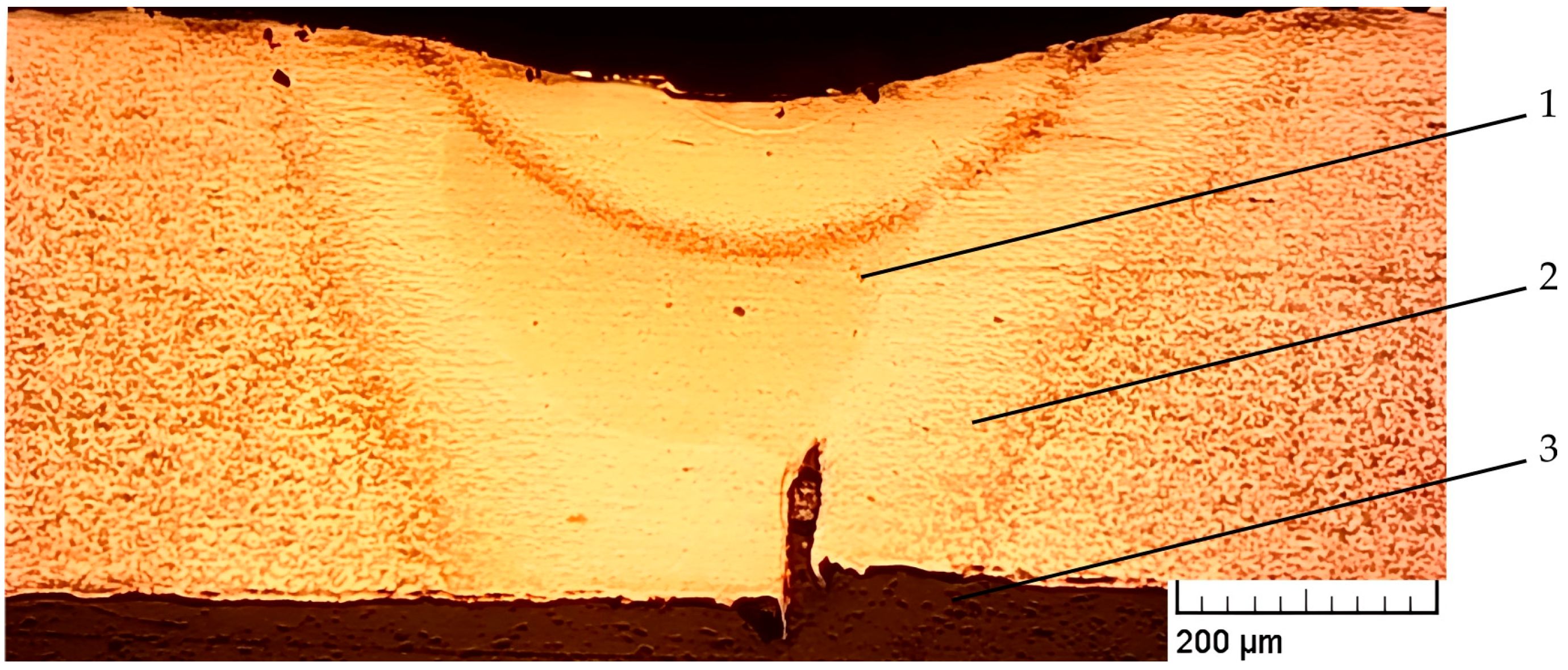 The incomplete melting zone, observed in the cross-section at the boundary between the melting zone and the adjacent base material, represents a region where only partial melting has occurred. Due to insufficient heat input, complete fusion was not achieved, leading to a microstructure that differs from both the fully melted and unaffected areas. This transition zone exhibits microstructural characteristics shaped by partial diffusion between solid and liquid phases, which may impact the overall mechanical integrity of the weld.