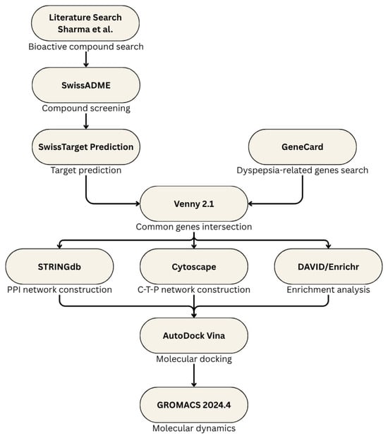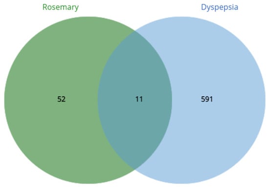 Using the GeneCard database (https://www.genecards.org/, accessed on 22 July 2024) [], the genes related to dyspepsia were obtained. Here, the genes obtained were based of the relevance scores in the database. Identified disease-related genes were then filtered to top 25% by quantile using Python 3.12.4, and the Pandas 2.2.2 library. The top 25% results were selected to narrow down the set of genes involved and to ensure their relevance while having sufficient data. Consequently, the common genes from dyspepsia and S. rosmarinus were identified using the bioinformatics tool Venny 2.1 (https://www.biotools.fr/misc/venny, accessed on 22 July 2024) [].