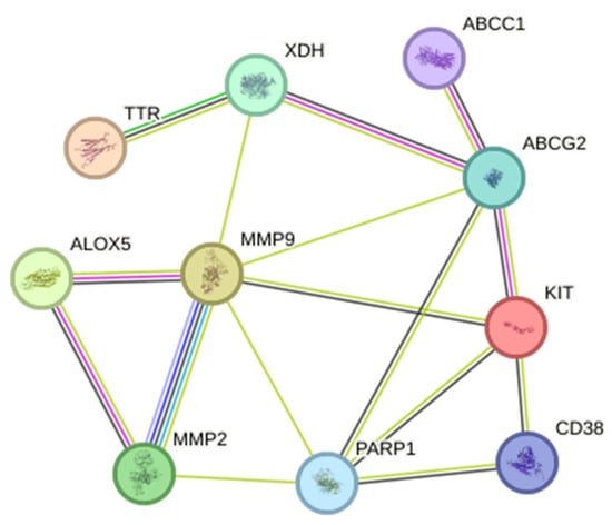 Using the GeneCard database, there were a total 2832 dyspepsia-related genes obtained and was limited to 602 genes after getting the top 25% by quantile. On the other hand, the target genes of S. rosmarinus had a total of 1000 which was narrowed down to 63 after getting the targets with probability ≥ 0.70. After the crossover, it was found that 11 common genes were found: proto-oncogene c-Kit, transthyretin, matrix metalloproteinase-9, polyunsaturated fatty acid 5-lipoxygenase, 72 kDa type IV collagenase, xanthine dehydrogenase/oxidase, broad substrate specificity ATP-binding cassette transporter, glycogen synthase kinase-3 beta, poly [ADP-ribose] polymerase 1, ADP-ribosyl cyclase/cyclic ADP-ribose hydrolase 1, and multidrug resistance-associated protein 1. The crossover of genes was done through a venn diagram and is visualized in Figure 2. Moreover, the known functions of each traced proteins can be seen in Table 4.