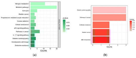 (a) S. rosmarinus KEGG pathways from DAVID. Light green bars represent terms with smaller p-value, while dark green bars represent terms with higher p-value. (b) Common pathways involved in S. rosmarinus and functional dyspepsia. Light red bars represent terms with smaller p-value, while darker red bars represent terms with higher p-value.