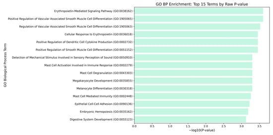 Moreover, the proto-oncogene receptor tyrosine kinase (KIT) gene was found to be involved in the MAPK signaling pathway. This pathway is responsible for the downregulation of Glial Cell Line-Derived Neutrophic Factor (GDNF)—resulting to the overexpression of microRNA-211 the expression of which in dyspepsia was found to be significantly increased []. The matrix metalloproteinases were found to be related to the sustained angiogenesis, which is closely associated with chronic inflammation due to H. pylori infection. Here, the upregulation of pro-angiogenic factors can lead to changes in the gastric mucosa, which can lead to dyspepsia []. The enrichment analysis of KIT through gene ontology biological processes also provides a valuable insight into functional dyspepsia. Among the most notable pathways are those associated with rythropoietin signaling, smooth muscle cell differentiation, immune cell activation, and mechanosensory perception which are all interconnected in the disruption of gut motility, immune regulation, and visceral sensitivity.