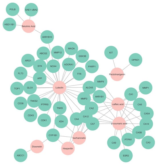 Compound and target network. Nodes in cyan represent the targets predicted, while nodes in pink represent the compounds found in S. rosmarinus.