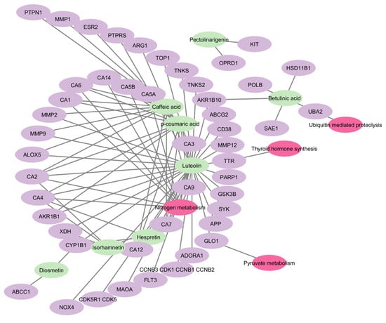 Combined network of compound to target and target pathway. Green nodes represent the bioactive compounds found in S. rosmarinus, purple nodes represent the targets of the respective compounds, whole pink nodes represent the pathways in which the targets are enriched.