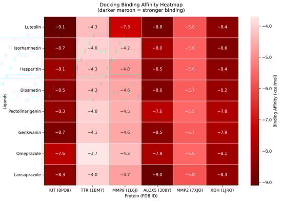 The results of the molecular docking showed that the compound with the highest binding affinity was luteolin and proto-oncogene c-Kit, with a docking score of −9.1 kcal/mol. Compared to the two controls, omeprazole and lansoprazole, luteolin exhibited a significantly higher docking score. The complete docking scores for all the protein candidates are visualized through a heatmap and can be seen in Figure 9. Moreover, the result of the docking indicates that luteolin may bind to the proteins in the pathways of dyspepsia, specifically, that of KIT. Another point of interest are the intermolecular forces acting upon the complexes. As seen in Figure 10, luteolin and KIT exhibited unfavorable acceptor-acceptor interaction, which nevertheless demonstrated key stabilizing interactions such as van der Waals, conventional hydrogen bond, and carbon hydrogen bond. These interactions suggest that the ligand retains the potential to bind within the binding sites despite the structural limitations. The models and diagram for the remaining complexes are found in Appendix A.