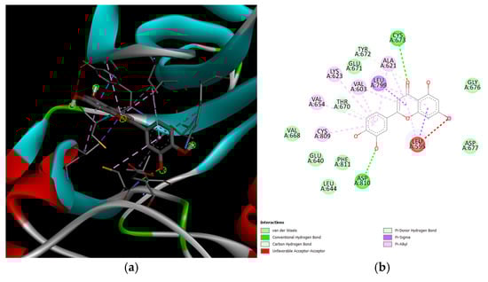 KIT and luteolin complex. The leftmost figure (a) shows the interactions between the two proteins (KIT and luteolin). The rightmost figure (b) shows the 2D diagram of interactions between the two proteins, as well as the intermolecular forces acting upon the complex.