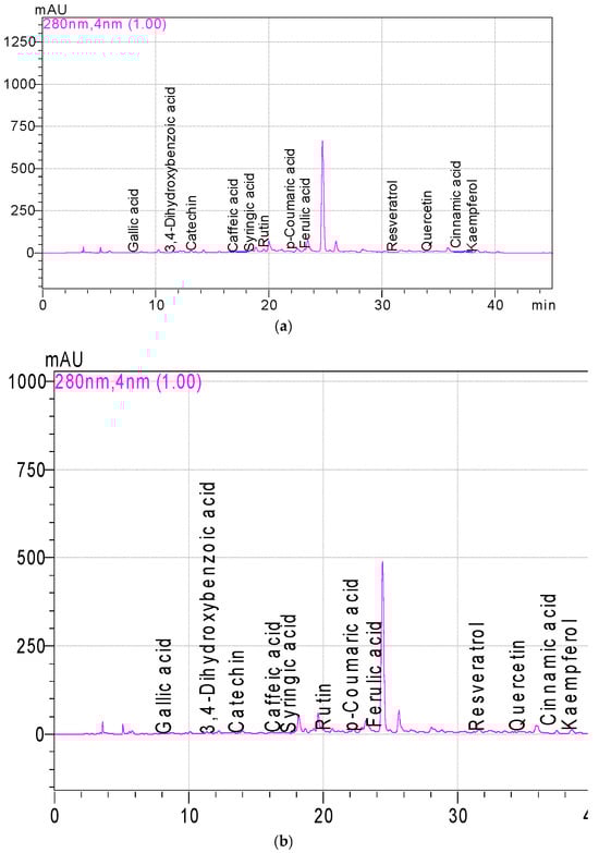 A high-performance liquid chromatography (HPLC Shimadzu LC 10A vp, Kyoto, Japan)-equipped column (5 µm, 25 cm × 4.6 mm) (Inertsil ODS3 analytical column) and Shimadzu SPD-M20 A Diode Array Detector at 280 and 330 nm were used to determine phenolic compounds in olive leaf extracts [15]. Gradient elution was performed for separation and a mixture of 0.05% acetic acid in water (A) and acetonitrile (B) was used as the mobile phase. The following elution programme was employed: 0–0.10 min 8% B; 0.10–2 min 10% B; 2–27 min 30% B; 27–37 min 56% B; 37–37.10 min 8% B; 37.10–45 min 8% B. The injection volume and total running time per sample were 20 µL and 60 min, respectively. Phenolic compounds were determined according to the retention time and absorption spectra of peaks of standard compounds. The total area under the peak was used to quantify each phenolic.