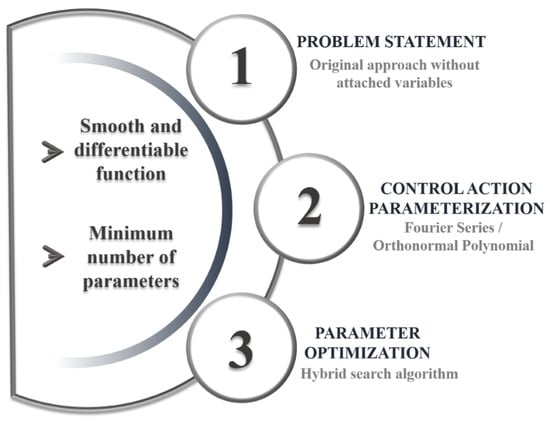 Steps 4, 5, and 6 are repeated iteratively until the results converge. Finally, the optimal control action for the given problem is obtained. It is worth noting that this dynamic optimization strategy is not limited to smooth function searches, as non-uniform (but still continuous) profiles can be obtained by adding terms to the Fourier series and consequently increasing the polynomial order. The overall procedure of the dynamic optimization strategy is schematically illustrated in Figure 1.