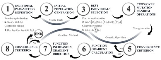 Monte Carlo is a simulation and statistical analysis technique used to solve complex problems and estimate results through random sampling [37]. In this context, it is employed to generate the initial population of individuals for the genetic algorithm. An elitist methodology is applied to select the most capable individuals. The general procedure involves forming random sets of parameters, where each set (individual) is evaluated by simulating the process and calculating the corresponding objective function (Equation (3) for Fourier optimization and Equation (20) for controller tuning).