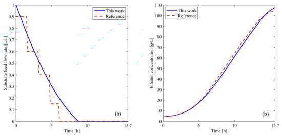 Figure 4a shows the obtained substrate feed rate compared with the one reported in the reference. As can be seen, the result achieved with the proposed strategy presents a smooth and continuous profile, allowing its direct application in the real system without the need for signal-smoothing filters. Moreover, only three parameters are used for optimization, whereas [26] employs at least ten, demonstrating the efficiency and simplicity of the approach. It is worth noting that the entire proposed algorithm involves approximately 3500 iterations, with a simulation time of around 3 min, highlighting the computational feasibility of the method.