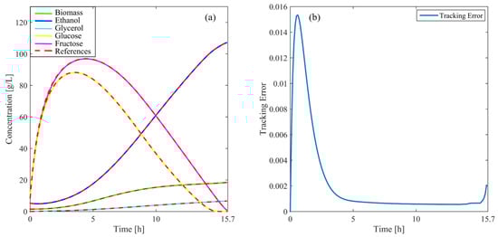 Figure 5 illustrates the concentration profiles for cells, ethanol, glycerol, and fructose throughout the simulation. These profiles closely follow the reference values, showcasing the precise ability of the controller to track the state variables of the system. The high degree of accuracy achieved highlights the capacity to maintain stable and efficient process control. Moreover, Figure 5 displays the evolution of the tracking error (, Equation (21). As the process advances, the error decreases steadily, remaining within very low limits. This indicates that the controller effectively minimizes deviations from the reference, continuously tending toward the target values as the simulation progresses. The low magnitude of the tracking error underscores the stability and robustness of the controller under nominal conditions. Additionally, the smooth adaptation to system dynamics demonstrates its capacity to maintain optimal performance without compromising control precision.