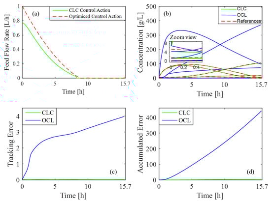 Controller response to a modification of the initial conditions: (a) feed rate variation; (b) concentration profiles vs. reference values; (c) tracking error in CLC and OLC; (d) accumulated error in CLC and OLC.