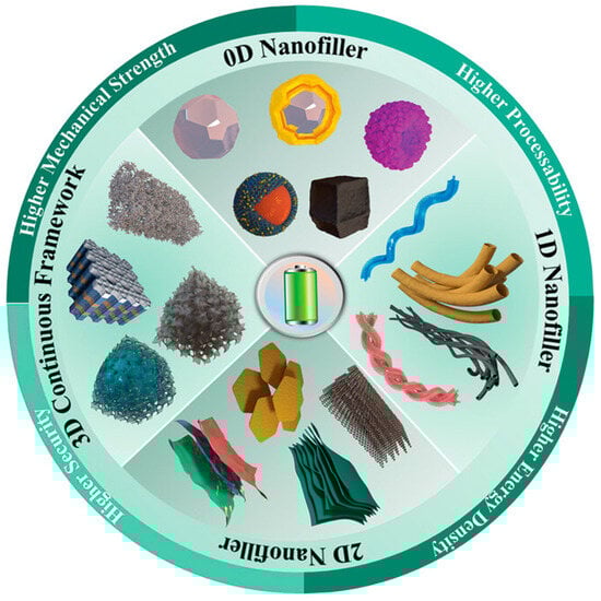 To enhance the electrochemical characteristics of OICSEs, inorganic fillers with diverse dimensional structures, including zero-dimensional particles, one-dimensional nanowires, two-dimensional nanosheets, and three-dimensional frameworks (Figure 1), have been purposefully designed and extensively studied [36,37,38]. The diverse shapes of these fillers contribute to the formation of continuous lithium-ion conduction pathways and establish rapid ion-conducting pathways between the cathode and anode [39]. Compared with inert fillers, active fillers possess intrinsic ionic conductivity, allowing them to directly participate in ion transport processes. Moreover, they can form highly conductive percolation networks with the polymer matrix in OICSEs, which greatly improves the electrochemical efficiency of the entire battery system [40,41].