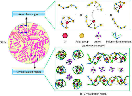 A schematic diagram illustrating the conduction mechanisms in the two regions of polymer electrolytes. Reproduced with permission from Wu, F, Mater. Horiz.; published by Royal Society of Chemistry, 2016 [42].