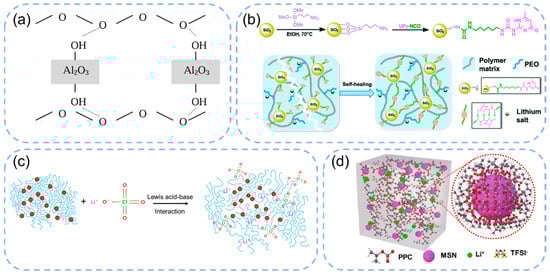 (a) Illustration of the interaction mechanism among PEO chains and Al2O3 surface groups. Reproduced with permission from Croce, F, J. Appl. Electrochem; published by Springer, 2004 [63]. (b) Process flow for preparing SiO2-UPy and schematic of the SHCPE architecture based on supramolecular networks. Reproduced with permission from Xue, Z, J. Mater. Chem. A; published by Royal Society of Chemistry, 2019 [64]. (c) The brief mechanism of strong Lewis acid–base interaction between PEO chains, SiO2, nanoparticles, and LiClO4. Reproduced with permission from Zhang H, ACS Appl. Mater. Interfaces; published by American Chemical Society, 2020 [65]. (d) Conceptual schematic of composite solid polymer electrolytes. Reproduced with permission from Park, C.-J, Energy Storage Mater.; published by Elsevier, 2021 [66].