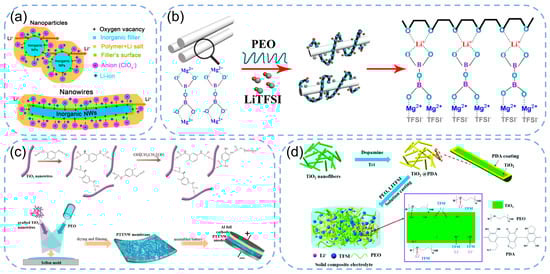(a) Illustration depicting Li-ion conduction assisted by nanoparticle and nanowire inclusions. Reproduced with permission from Zhang, W, Nano Lett.; published by American Chemical Society, 2018 [67]. (b) Schematic illustration of lithium-ion transport in Mg2B2O5 enhanced OICSEs. Reproduced with permission from Sheng, X. Q, Int. J. Energy Res.; published by Wiley, 2019 [68]. (c) Schematic illustration of TiO2 modified with TDI and OICSE preparation. Reproduced with permission from Xu, G, Nanoscale; published by Royal Society of Chemistry, 2022 [70]. (d) Schematic illustration of the OICSE preparation process. Reproduced with permission from Xu, C, ACS. Appl. Energy Mater.; published by American Chemical Society, 2021 [71].