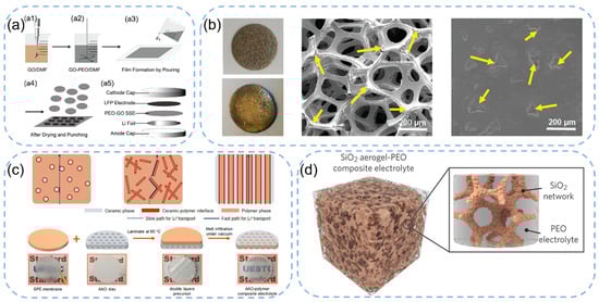 (a) Preparation schematic of GO-PEO hybrid solid polymer electrolyte alongside assembly steps for solid-state LiFePO4||GO-PEO||Li battery. Reproduced with permission from Zhang, Q, Adv. Funct. Mater.; published by Wiley, 2019 [72]. (b) Digital photographs and matching top-view and cross-sectional SEM images of Ni foam and Li-Ni composite. Reproduced with permission from Yang, S, Adv. Energy Mater.; published by Wiley, 2020 [73]. (c) Schematics of composite solid polymer electrolyte featuring three geometric configurations of the ceramic–polymer interface. Reproduced with permission from Cui, Y, Adv. Mater.; published by Wiley, 2018 [75]. (d) Schematic representation of the fabrication procedure for SiO2-aerogel-enhanced CPE. Reproduced with permission from Liu, P, J. Membr. Sci.; published by Elsevier, 2021 [76].