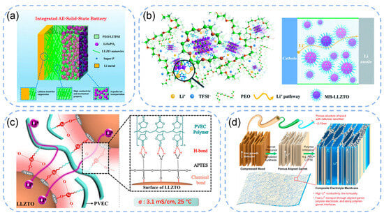 (a) Schematic illustration of an integrated LiFPO4/CSE/Li battery [49] Reproduced with permission from Wang, C. A. J. Mater. Chem. A; published by Royal Society of Chemistry, 2019. (b) Diagram depicting the architecture of MB-LLZTO-CPE and the effect of lithium-ion domain diffusion. Reproduced with permission from Li, L. J. Mater. Chem. A; published by Royal Society of Chemistry, 2019 [87]. (c) Illustration of the synthesis process for an OICSE that mediates interaction between the polymer matrix and ceramic fillers. Reproduced with permission from Hu, L. ACS Mater. Lett.; published by American Chemical Society, 2019 [88]. (d) Visual representation of a mesoporous LLZO membrane with multiscale alignment, combined with PEO polymer. Reproduced with permission from Ramaswamy, M. ENERG·FUEL; published by American Chemical Society, 2023 [89].