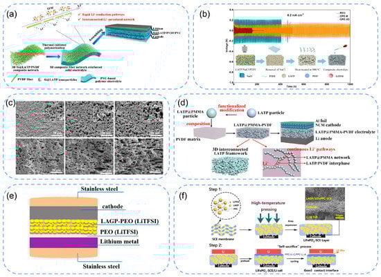 (a) Schematic illustration for the preparation of 3D composite fiber network-reinforced CPE. Reproduced with permission from Fan, L. Z. Energy Storage Mater.; published by Elsevier, 2022 [93]. (b) Schematic diagram of the fabrication of CPE−3D and long-term cycling performance of Li||PEO||Li, Li||CPE-R||Li, and Li||CPE−3D||Li symmetric batteries at 0.2 mA cm−2. (c) Top and cross-sectional images of the 3D porous LATP framework fabricated with varying NaCl template mass fractions. Reproduced with permission from Xiong, Y. J. Power Sources; published by Elsevier, 2021 [94]. (d) Illustration of the fabrication process and working principle of the 3D LATP@PMMA-PVDF composite electrolyte used in NCM811/Li solid-state batteries. Reproduced with permission from Ding, F. ACS Appl. Mater.; published by American Chemical Society, 2017 [95]. (e) All-solid-state Li-PEO (LiTFSI)||LAGP-PEO (LiTFSI)||LiMFP cells. Reproduced with permission from Yu, A. ACS Appl. Mater. Interfaces; published by American Chemical Society, 2019 [96]. (f) Schematics of the all-solid-state battery assembly. Reproduced with permission from Goodenough, J. B. J. Am. Chem. Soc.; published by American Chemical Society, 2020 [97].