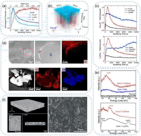(a) Normalized TOF-SIMS depth profiles of three species of interest. (b) Three-dimensional view of the sputtered volume in panel a. Only CsLi2P− and Zr− are shown for clarity. (c) Depth profiles derived from cycled, handled, and pristine samples. Reproduced with permission from Li, J. J. Am. Chem. Soc.; published by American Chemical Society, 2020 [51]. (d) HAADF-TEM images of PAN/LiClO4 and the PAN/LiClO4. (e) Selected region EELS spectra covering organic particles, organic-to-organic interfaces, polymer phase, and polymer-to-inorganic interfaces. Reproduced with permission from Cui, G. Adv. Funct. Mater.; published by Wiley, 2021 [99]. (f) Cross-sectional SEM view, 3D reconstruction, and 2D sectional images of p-LATP taken from x-y and x-z planes. Reproduced with permission from Cui, G. Adv. Sci.; published by Wiley, 2023 [100].