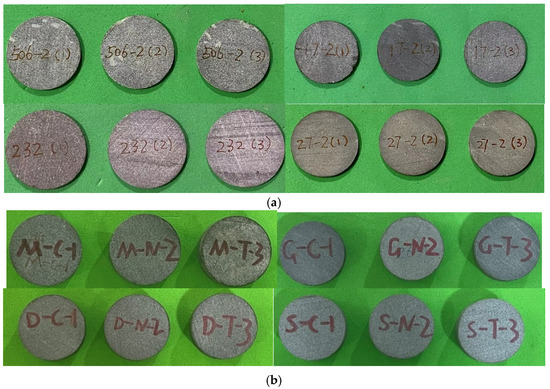 The experiment selected natural rock cores with the same or similar permeability and porosity in each block, and sliced them according to the requirements of the industry standard “SY/T 5153-2017—Determination Method for Wettability of Reservoir Rocks” [48], with a specification of 25 mm × 2 mm, as shown in Figure 1.