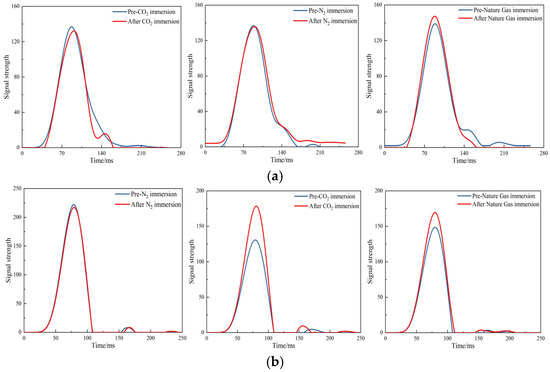 Comparisons of NMR spectra before and after energy supplementation with natural gas, CO2 and N2 in M2 block (a) and G93 block (b).