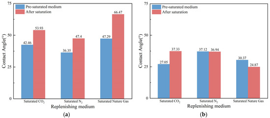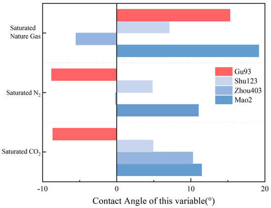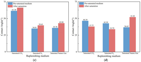The impact of different energy supplements media on the changes in the wettability of various reservoirs is compared, as shown in Figure 4. The results indicate that when considering the injection of different media with the same lithology, CO2 and natural gas have a significant effect on increasing the wetting angle of the four blocks, with natural gas having a more significant impact on M2 and G93. Natural gas has high fluidity, low viscosity, and good injectability. Although the affected volume is limited by its low viscosity and high fluidity, the overall effect is good. The contact angle of the rock samples in Block M2 changed the most before and after saturation with natural gas, and the wettability of the rock samples changed from strong hydrophilicity to weak hydrophilicity. When the rock sample is saturated with CO2, the increment is also significant, with a 27% increase in the wetting angle. Due to the low viscosity and high fluidity and solubility of CO2, the injection affects a larger volume, resulting in more obvious changes. Compared to the change in contact angle caused by CO2, N2 has a smaller effect on the contact angle of rock samples because N2 has a smaller molecular weight, better flowability and injectability, but a relatively lower swept volume, resulting in lower effectiveness than CO2. The pore connectivity of G93 is the worst and the densest due to its high capillary force, poor oil displacement effect, the lower miscibility of CO2 and oil, and small change in wetting before and after. Therefore, when the rock sample is saturated with CO2, the average change in the contact angle is relatively small. Despite this, the rock samples in this block still maintain strong hydrophilic properties after being saturated with these three media, without significant changes in wettability. Overall, the contact angle and wettability of the same rock type exhibit different characteristics when saturated with different media. CO2 and natural gas have a greater effect on increasing the wetting angle of the four blocks, with natural gas having a more significant effect, but overall maintaining its hydrophilic characteristics.