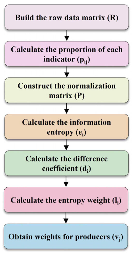 Information entropy, an index of the degree of chaos in information systems, is a crucial metric for quantifying the uncertainty of random variables and has been widely applied in many fields. Since its concept was proposed, it has essentially functioned in the assessment of suitability or risks such as engineering disasters and multi-criteria decision analysis. The reason lies in that it can objectively evaluate the distribution of each evaluation factor and to some extent exclude the interference of evaluator’s subjective factors on evaluation results. In this study, the information entropy theory is introduced to reflect the development effect of each producer by evaluating the degree of disorder of its evaluation indexes and selecting indexes such as injection–production ratio as the basis for measuring the development effect. When these indexes are more dispersed, the information entropy value is smaller, and the corresponding weight is larger, and vice versa. Therefore, the contribution weights of producers in the well group can be determined by analyzing the degree of dispersion in indexes of each producer. Specifically, the EWM is employed to derive the entropy weight of each evaluation index based on the degree of differentiation of evaluation index values for each producer. Subsequently, the entropy weight of each evaluation index is weighted for all producers to obtain objective evaluation results. The evaluation process is depicted in Figure 2. The basic steps of the EWM are described as follows: