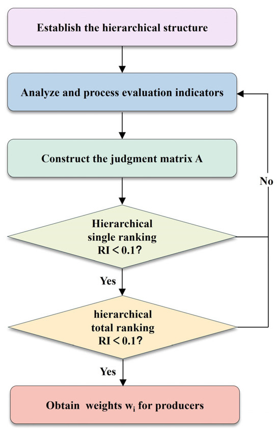 The standard implementation procedure of the method comprises four key steps: (1) designing the hierarchical architecture; (2) constructing the judgment matrix; (3) performing hierarchical single ranking and consistency validation to solve the eigenvector and calculate the maximum eigenvalue; (4) hierarchical total ranking and consistency validation. The evaluation flow is exhibited in Figure 3. The steps are described in detail as follows.