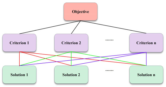 After an in-depth and comprehensive analysis of the specific problem, various elements of the problem are accurately decomposed and categorized into a hierarchical architecture with strict affiliation upon their intrinsic logical connections and hierarchical attributes, including the objective layer, the criterion layer, and the solution layer. The hierarchical architecture of the hierarchies and relationships between elements is accurately visualized and depicted by a block diagram. If the number of elements in a particular layer is large, it will be decomposed into several sub-layers to optimize the clarity and logical coherence of the hierarchical architecture. In the constructed hierarchical model, the elements of the same layer are both dominated and constrained by the elements at the previous layer. Meanwhile, they exert influence and regulation on elements at the next layer. The top of the hierarchical architecture is the objective layer, which generally contains only one core element, and the bottom of the architecture is the solution layer. Between the objective and solution layers are one or more criterion layers, which are essentially composed of indexes or guideline layers, as exhibited in Figure 4.