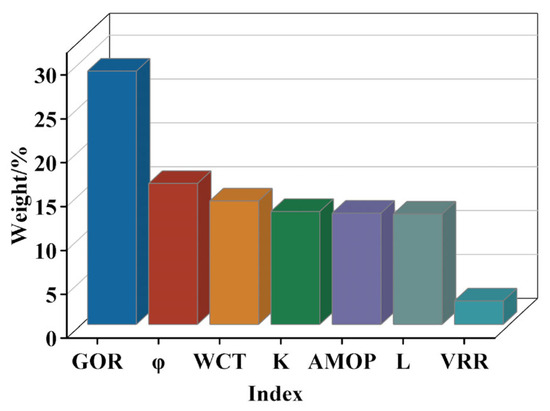 Following the EWM process in Section 2.2, the standardized data are input into corresponding Equations (5)–(7) to calculate evaluation index values of producers (Table 7). GOR has the greatest influence on the development effect of producers, accounting for 28.9% among seven categories of indexes; the porosity is second, accounting for 16.1%; and the influence of VRR is the smallest, with a value of only 2.7%, as illustrated in Figure 5. The weights of other indexes are not significantly different, suggesting that development indexes have the greatest influence, followed by geology indexes and engineering indexes have the smallest influence. This result is consistent with the empirical knowledge during the development process.