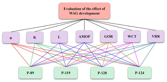 Additionally, static and dynamic data of the well group are collected and collated from the oilfield site with various factors taken into account to fully characterize the WAG development effect of producers in the test area. Attributed to the short production time and in the experimental stage, the dataset contains information collected from four horizontal producers at the oilfield site one year before and six months after the test, including well ID, porosity (φ), permeability (K), horizontal length of the producer (L), average monthly oil production (AMOP), gas–oil ratio (GOR), water cut (WCT), and injection–production ratio (VRR). Specifically, there are signs of gas breakthrough, and GOR is high, owing to the injection of a large amount of gas before the implementation of the test area. Hence, the data after six months of the test are screened to weaken the residual effect of gas injection. After logical analysis from three dimensions of geology, engineering, and development, redundant parameters or indexes are eliminated. Meanwhile, we select evaluation indexes that can accurately reflect the development effect of producers with WAG flooding by combining the actual data sources in the field, as detailed in Table 5 and Table 6.