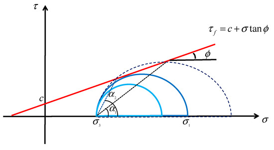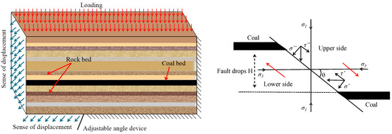 Based on the geometric relationship between the fault dip angle and the principal stress components, it can be considered that the maximum principal stress and the minimum principal stress satisfy the following relationship [42,43]: