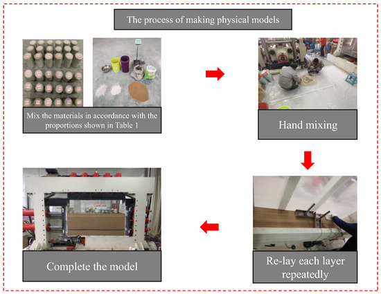 where represents the strength similarity constant, represents the bulk density similarity constant, represents the geometric similarity constant, and represents Geometric similarity ratio. Additionally, the subscript “p” denotes the prototype, the subscript “m” denotes the physical model, the subscript “” denotes stress or strength values in the prototype and model (in MPa or KPa), the subscript “” denotes geometric length in the prototype and model, respectively.