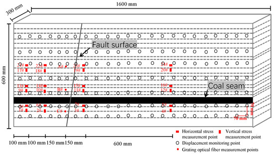 The test procedure is shown in Figure 2. The length × height × width of this box has been adjusted to 160 cm × 60 cm × 30 cm and with an inclination angle of 70°. Prior to construction, the left and right baffles were fixed to the designated boundaries, and the upper loading frame was restored to its initial height to allow full model assembly. The left and right base plates were carefully leveled, and a Teflon plate was placed adjacent to the left baffle to minimize boundary friction. A transparent acrylic plate was installed at the front for visual observation, while U-shaped steel channels were mounted on the rear side, marked with the target thickness of each stratigraphic layer to guide accurate deposition. Model construction followed a layer-by-layer compaction approach. For each simulated stratum, the required quantities of sand, calcium carbonate, gypsum, and water were weighed using an electronic scale, mixed thoroughly, and poured into the box. The material was then leveled and compacted uniformly to the designed thickness. Between each layer, a thin layer of mica powder was spread to ensure stratigraphic separation and simulate bedding planes or potential slip surfaces. This process was repeated sequentially to replicate the full sedimentary sequence, as shown in Figure 2. Following model preparation, a comprehensive monitoring system was deployed. Stress monitoring was performed using a DH3816 static strain acquisition system, while strain monitoring employed TV-1600-08 grating optical fiber sensors embedded at key locations. The sensor layout is shown in Figure 3, a total of 184 reflective markers were arranged at 70 mm intervals on the model surface, and high-resolution video recording was used to document the full process of fault initiation and propagation. Boundary conditions were strictly controlled: the right and bottom sides of the model were fixed, and a vertical compensating load was applied from above to simulate the overburden stress of unmodeled strata. Dynamic loading was introduced via two actuators—one on the left boundary moved horizontally, while a second hydraulic actuator at the lower left applied vertical loading downward—both at a constant rate of 0.01 mm/s. Additionally, an upper actuator above the fault region applied vertical load at 0.015 mm/s. The test concluded once fault slip stabilized and the displacement reached the pre-defined drop height of the coal seam.