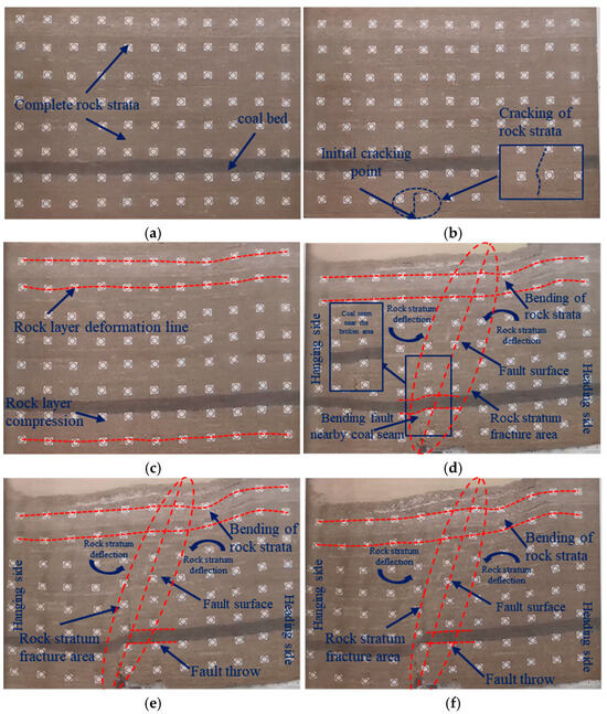 The development process of the normal fault is shown in Figure 4. Initially, the rock layers were intact. After loading, stress accumulated, causing fractures to initiate and extend inward; during the expansion stage, the deformation of the upper and lower parts of the rock layers intensified, and the shear displacement of the lower block was significant, showing a non-uniform characteristic. As the fault slipped, the fault gap increased, the rock layers bent and deviated, forming a distinct fold structure, and on both sides of the fault zone, fractured zones gradually developed. Eventually, the fault became stable and took on a bent shape, with a fracture angle greater than 70°, and the coal layer showed a significant drop. The fractures were mainly concentrated from the initiation to the early stage of slip and then gradually closed. Overall, it presented strong deformation of the rock layers and significant redistribution of stress, with more severe damage to the lower block. The figure clearly shows the spatial characteristics of the rock layer deflection and the development of the fractured zone under the control of the fault, further revealing the complexity of the rock mass structure during the fault evolution process.