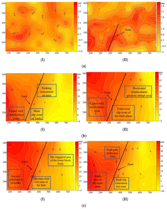 During the formation of a normal fault, the evolution process of the rock layer displacement field closely corresponds to the fault development stages described in Section 3.1, reflecting the non-uniform deformation response driven by tectonic stress. Figure 5a illustrates the stage of fault initiation and fracture expansion, at which the rock layer stress is concentrated, the vertical displacement of the upper plate increases rapidly, the fractures expand inward from the fault plane, and the deformation of the upper and lower parts of the rock layer is significant. Figure 5b corresponds to the fault slip stage, where significant non-uniform displacement occurs on the upper plate of the fault, the rock layer bends and deflects, and a fracture zone develops, reflecting the intense structural adjustment during the stress release process. Figure 5c is consistent with the stable fault stage, where the displacement field becomes more gentle, the fault structure is formed, and the rock layer enters a relatively stable state. Overall, the displacement evolution process in Figure 5 clearly reflects the deformation characteristics of the normal fault development from initiation to slip to stability, verifying the temporal sequence and stress control mechanism of fault structure evolution in Figure 4.