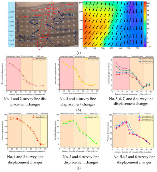 During the formation of a normal fault, the absolute value changes in the rock layer displacement reflect the dynamic response characteristics of the rock mass under tectonic stress. Figure 6 shows the displacement diagram after the formation of a normal fault. The displacement of the rock layer shows obvious spatial heterogeneity. The displacement near the fault is significant, especially in the upper part of the fault zone; the displacement in the area far from the fault changes slowly and approaches zero. This non-uniform feature is closely related to the spatial distribution of tectonic stress. During the slip stage, the redistribution of stress causes a rapid increase in local displacement, while the area far from the fault maintains a low displacement state. Experiments show that the displacement increases rapidly at the initial stage, gradually slows down, and stabilizes as stress is released. Fault slip not only changes the geometric shape of the rock layer but also triggers stress reconfiguration, further affecting the displacement distribution. Overall, the displacement evolution shows a “rapid initial stage-slow later stage” stage characteristic and the displacement of the upper coal layer is significantly greater than that of the lower layer, reflecting the spatial heterogeneity and stress response differences during the fault slip process. To further investigate the spatial variation in displacement, eight survey lines were selected across different structural positions relative to the fault zone. Lines No. 1–2 are located in the hanging wall near the fault core, where displacement is most severe. Lines No. 3–4 are positioned near the fault centerline, experiencing mixed bending and shear. Lines No. 5–8 extend into the footwall and peripheral zones, where displacement gradients are more gradual. The displacement profiles in Figure 6 show that: Lines 1–2 exhibit sharp vertical drops and high horizontal displacements, indicating active fault slip and rock bending in the hanging wall. Lines 3–4 show moderate displacement, reflecting transitional deformation. Lines 5–8 display relatively gentle displacement curves, located farther from the fault plane, mainly undergoing passive stress redistribution. This spatial pattern confirms that the deformation response of rock masses is strongly dependent on their relative position within the fault structure, with maximum displacement concentrated near the fault core and upper coal seam roof.