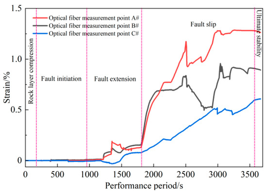 Figure 7 presents the strain data of different measurement points, reflecting the deformation process of the rock layer under the action of tectonic stress. It can be divided into four stages: fracture initiation, expansion, sliding, and stability. In the initiation stage, the strain at point A# increases, indicating that cracks have appeared in the rock layer in the stress concentration area; in the expansion stage, the strain at point B# rises slowly, and the crack extension is controlled by the regional stress, and the deformation is relatively gentle; in the sliding stage, the strain at point A# increases sharply, indicating that the stress is rapidly released and the rock layer undergoes intense deformation, which is the stage with the maximum displacement and strain; in the stability stage, the three curves tend to be stable, indicating that the stress release is sufficient and the rock layer enters a stable state, demonstrating the self-regulation ability of the rock mass.