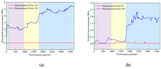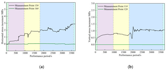 Stress changes in the roof of the lower coal seam. (a) Horizontal stress variation in the roof of the lower plate, (b) Vertical stress variation of the lower roof panel.