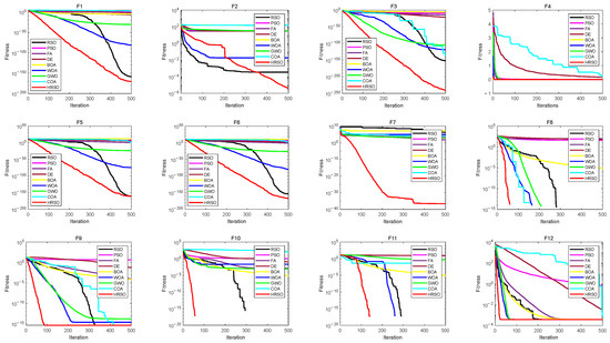 Figure 3. Convergence graphs of HRSO, RSO, PSO, FA, DE, BOA, WOA, GWO and COA.